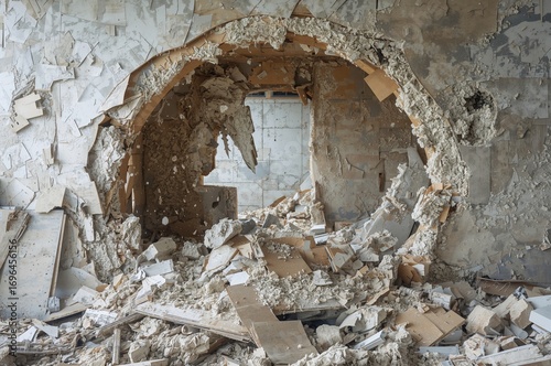 © vxnaghiyev, Fototapeta premium Destroyed drywall partition composed of plaster and cardboard, surrounded by debris and dust at a building site