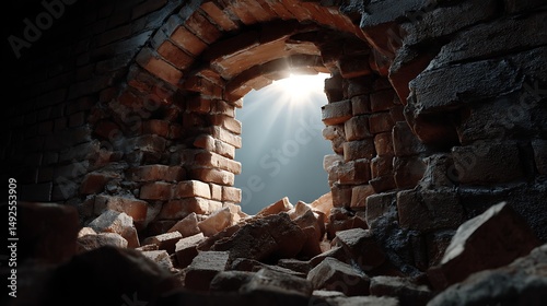 Fototapeta premium Destruction and light breaking through ruined wall abandoned location photo dark environment close-up view hopeful concept