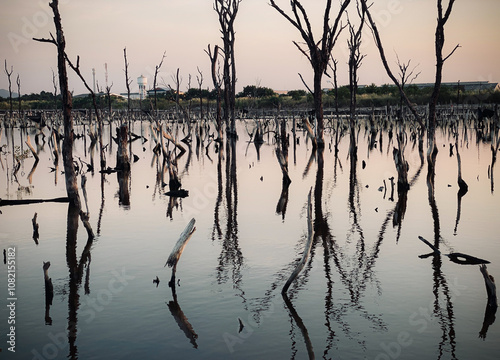 © Charisia, Fototapeta premium Destruction mangrove forest scenery, destruction mangrove forest is an ecosystem that has been severely degraded or eliminated such as habitat, and pollution, take care of the mangrove forest.