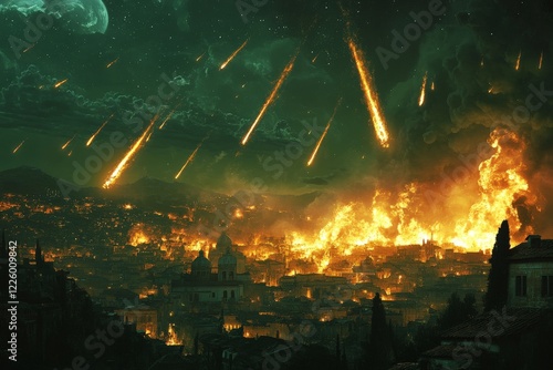 © ChaoticMind, Fototapeta premium Destruction of a city under meteor shower at night with vibrant flames engulfing buildings