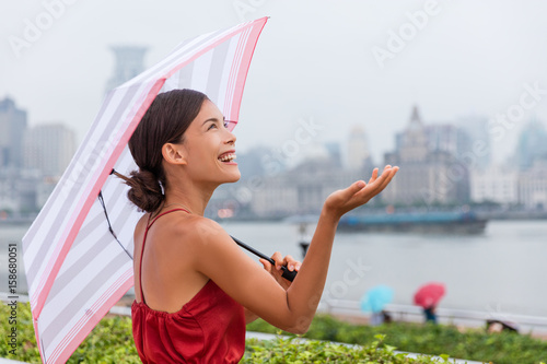 Fototapeta premium Deszcz, koncepcja pogody - szczęśliwa azjatycka kobieta turystycznych pod parasolem trzymając rękę do góry sprawdzanie ilości kropel deszczu podczas spaceru po mieście na nabrzeżu w Szanghaju. Młody chiński bizneswoman.