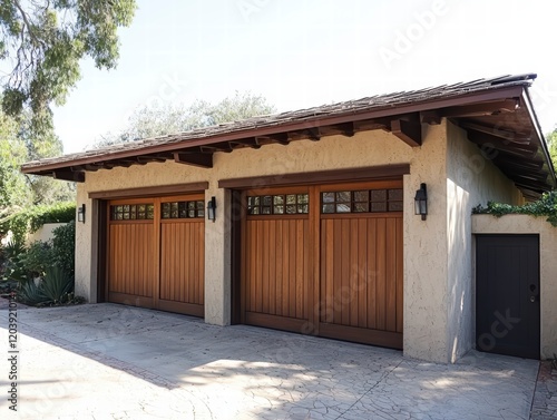 Fototapeta premium Detached Garage with Double Doors: A charming two-car detached garage with double wooden doors, showcasing a blend of rustic and contemporary architectural design.