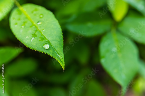 © Road Red Runner, Fototapeta premium Detail and close-up of raindrops on green leaves, texture and natural background