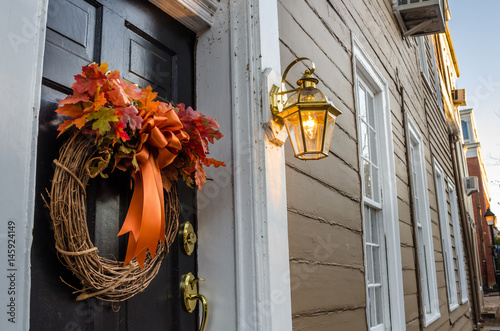 Naklejka premium Detail of a Black Wooden Door with a Halloween Wreath.