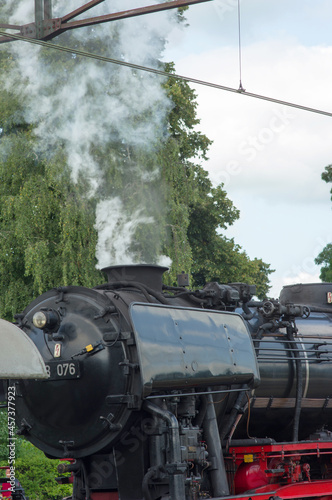 © photosis, Naklejka premium Detail of a old historic steam black locomotive with smoke at station Dieren in the Netherlands