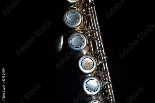 © zayacsk, Fototapeta premium Detail of central part of older transverse flute, silver coated with visible signs of heavy use and corrosion, on dark background.