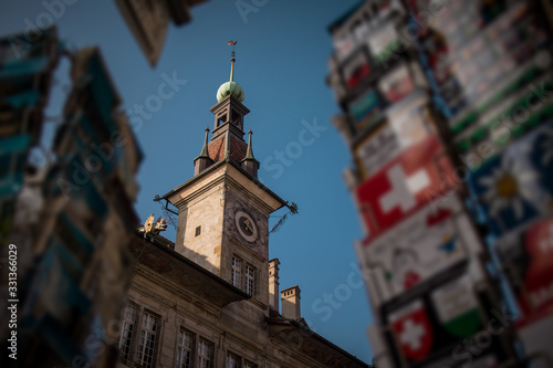 Fototapeta premium Detail of Lausanne City hall clock tower in early afternoon, looking through...