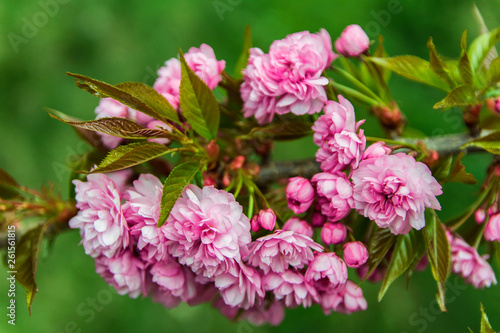 Obraz premium Detail of red cherry tree blossom on green background, spring time