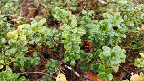 Fototapeta premium Detail of the northern autumn forest. Dark green saturated lingonberry leaves...