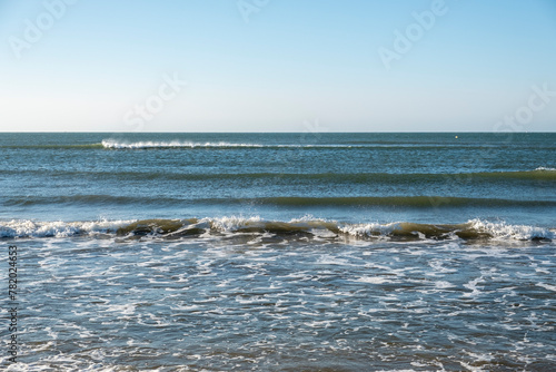 Fototapeta premium Detail of the waves of the Atlantic sea beating on the golden sand beach...