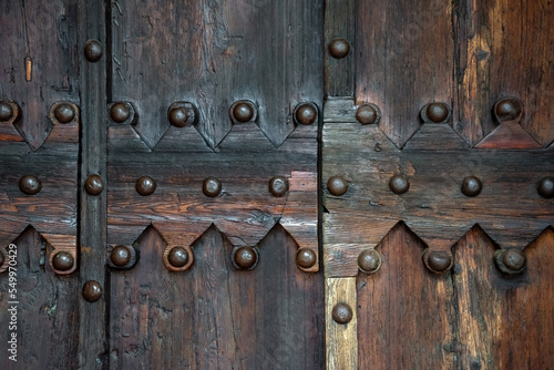 © Maxal Tamor, Fototapeta premium Detail of the wooden door of the Shrine Of the Beato Sante near Monbaroccio, a little fortified village in the Province of Pesaro e Urbino in the Italian region Marche