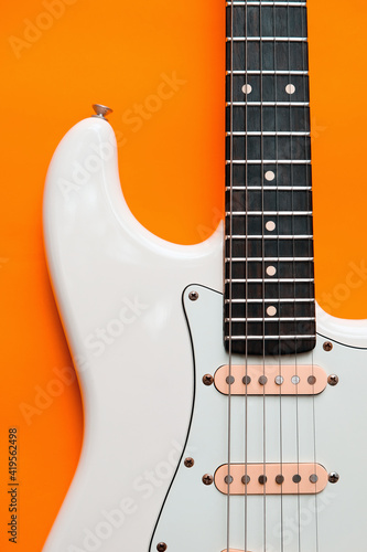 Fototapeta premium Detail of White Electric Guitar on a orange background.
