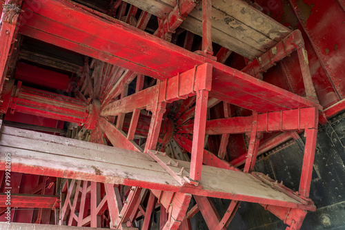 © MarekPhotoDesign.com, Obraz premium detail of wooden paddle wheel of Captain Meriwether Lewis sidewheeler dredge displayed in a dry dock in Brownville, Nebraska