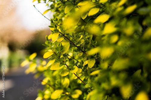 © Laura Stubbs, Obraz premium Detail on green and yellow shrub with soft focus