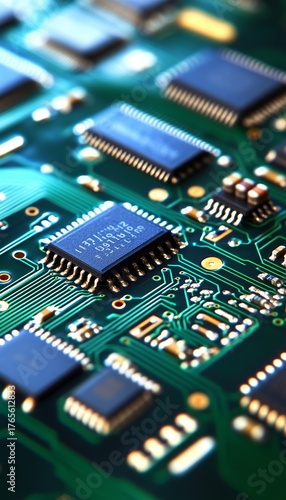 © Ilja, Obraz premium Detailed Aerial View of a Green Printed Circuit Board with Microchips and Electronic Components