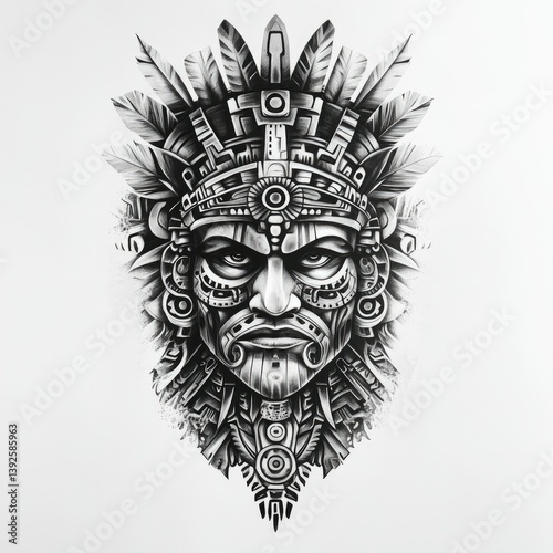 © KDG, Obraz premium Detailed Aztec Warrior Drawing with Headdress and Intense Expression