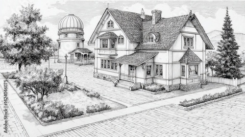 Fototapeta premium Detailed Black And White Architectural Sketch Of A Large House With Garden