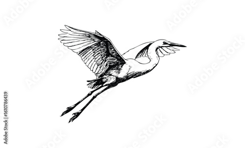 © Mr. Stocker, Obraz premium Detailed black and white heron illustration in flight. Vector retro hand drawn illustration