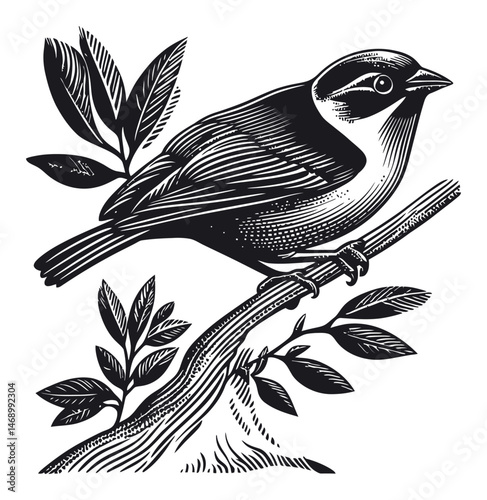 © Gasspoll, Naklejka premium Detailed Black and White Illustration of a Bird Perched on a Branch