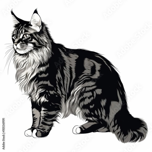 © Mark, Fototapeta premium Detailed black-and-white illustration of a majestic Maine Coon cat sitting upright, showcasing intricate fur patterns and a regal pose, drawn with fine linework on a plain white background.