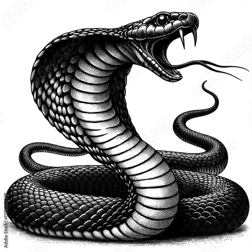 © Alexandru, Obraz premium Detailed Black-and-White Illustration of a Snarling Snake with Open Mouth against a White Background