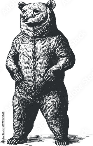 Fototapeta premium Detailed black and white illustration of a standing bear in a vintage sketch style.