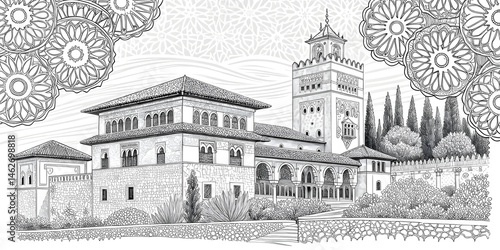 Fototapeta premium Detailed black and white illustration of Alhambra Palace in Granada, Spain, perfect for coloring books, architectural studies, travel posters, and historical depictions of Moorish architecture.