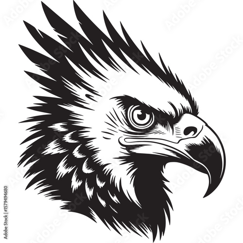 © SurrealSee, Fototapeta premium Detailed black and white line drawing of an eagle head facing right with sharp feathers and beak on transparent background