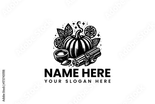 Obraz premium Detailed Black and White Logo Featuring Pumpkin Cinnamon and Leaves.