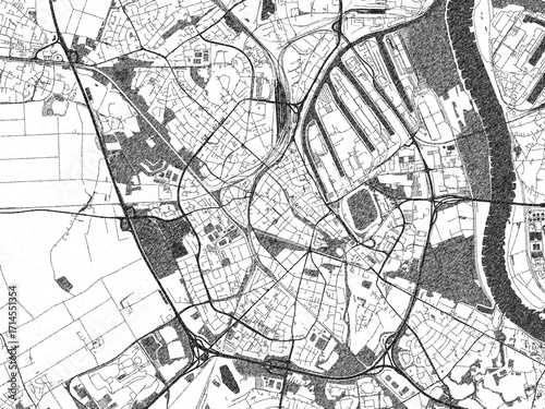 © W&S Stock, Naklejka premium Detailed black and white map of Neuss, Germany, in artistic sketch style.