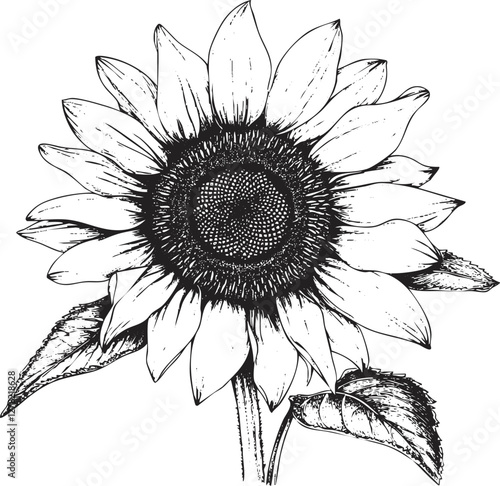 Fototapeta premium Detailed black and white sketch of a sunflower with petals and leaves.