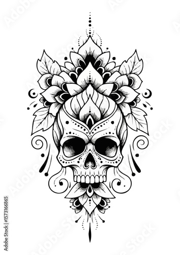 Fototapeta premium Detailed black and white skull illustration surrounded by floral elements