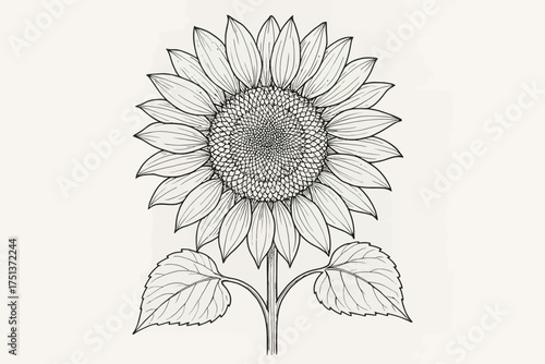 © Nataliia, Fototapeta premium Detailed black and white sunflower line art with leaves on white background