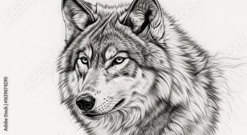 Fototapeta premium Detailed Black and White Wolf Portrait Drawing with Realistic Fur and Intense...