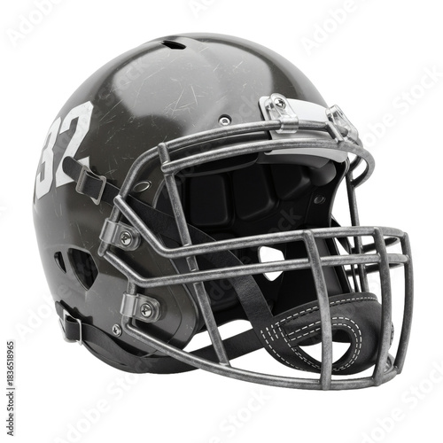 Fototapeta premium Detailed black football helmet with number 32 on transparent background