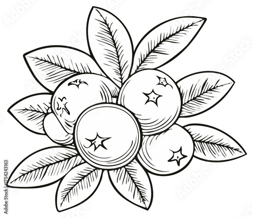 Fototapeta premium Detailed botanical illustration of a cluster of fresh berries with leaves line art drawing for design