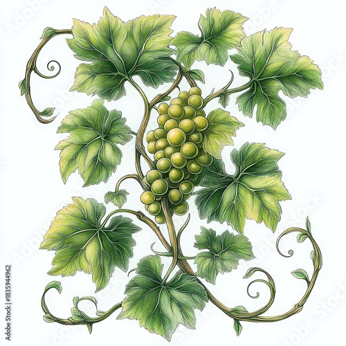 Fototapeta premium Detailed botanical illustration of a lush grapevine with clusters of green...