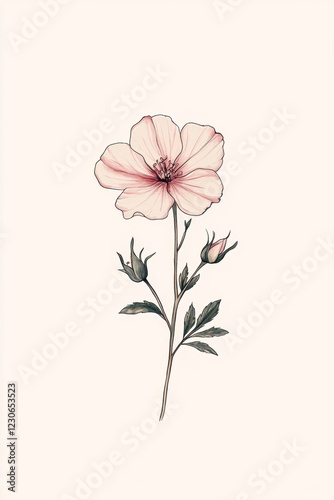© KerXing, Fototapeta premium Detailed botanical illustration of a pink flower with buds, showcasing nature's beauty on a cream background.