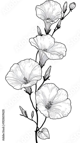 Fototapeta premium Detailed botanical illustration presents a vertical stem with delicate white morning glory flowers and small buds on a plain background.