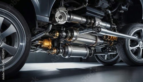 Fototapeta premium Detailed Car Suspension System with Wheels and Metallic Construction in...