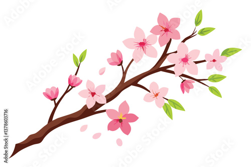 Fototapeta premium Detailed Cherry Branch with Pink Blossoms and Green Leaves on White