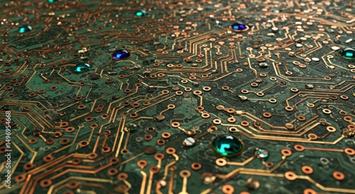 © Ascents, Fototapeta premium Detailed circuit board texture with embedded gems.