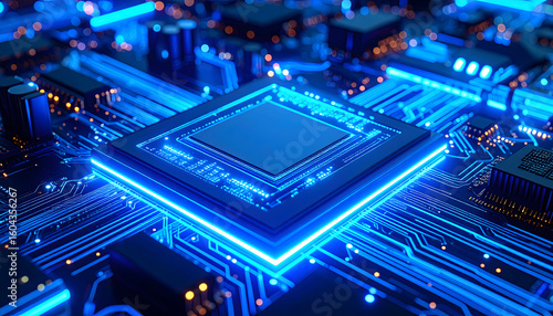 © Muhammad, Obraz premium Detailed circuit board with blue processor chip