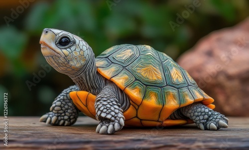 © ANUAR, Obraz premium Detailed close-up of a beautifully crafted turtle figurine showcasing realistic textures and vibrant colors against a natural background