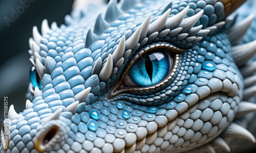 © Marwanto606, Fototapeta premium Detailed close-up of a blue dragon eye with scaled skin texture.