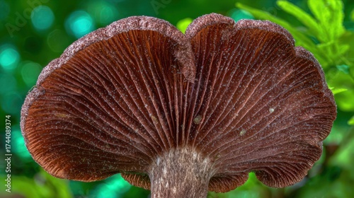 © lestari, Fototapeta premium Detailed close up of a brown mushroom underside with textured gills