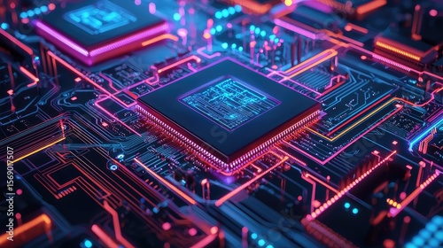 © rafani, Obraz premium Detailed close-up of a circuit board with glowing components.