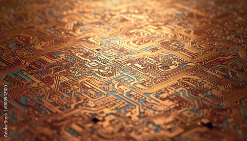 © MEO, Fototapeta premium Detailed Close Up of a Complex Golden Circuit Board Pattern