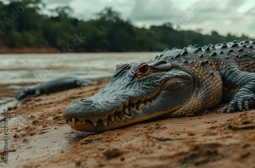 Obraz premium Detailed Close-Up of a Crocodile Lying on the Riverbank Surrounded by Lush...
