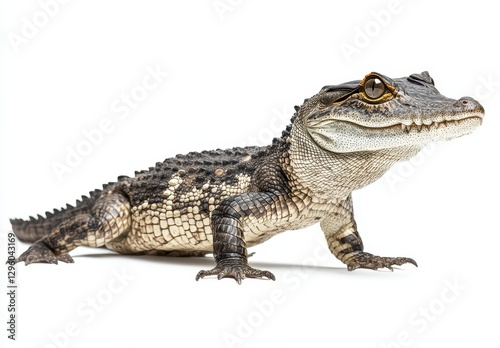 © ANUAR, Naklejka premium Detailed Close-Up of a Crocodile on White Background, Showcasing Scales, Eyes, and Body Structure in Natural Pose for Educational Purposes